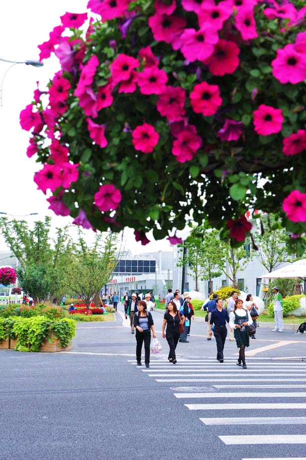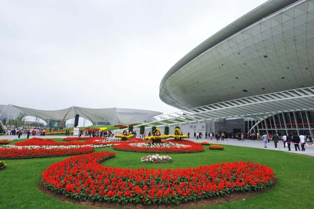 游人在上海世博文化中心花坛前游览(10月13日摄)。金秋十月,上海世博园鲜花争艳,游人如织,一派生机盎然的景象。新华社记者 张国俊 摄