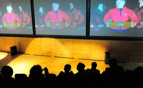 游客在视听室观看智利营救矿工的画面