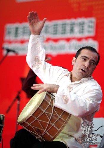 不管是在世博中心仪式现场,还是在欧洲广场中心舞台,阿塞拜疆木卡姆演奏组合首席鼓手的表演总是倾倒现场中外观众。
