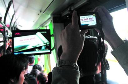 昨天10时17分,世博会累计参观者人数达7000万人次,游客在世博大道线上用相机记录下这一历史时刻。(蒋迪雯 摄)