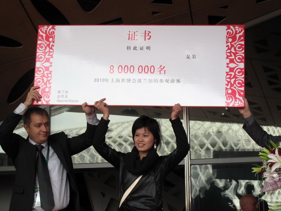波兰馆第八百万名幸运游客开心领奖(程娟娟摄)