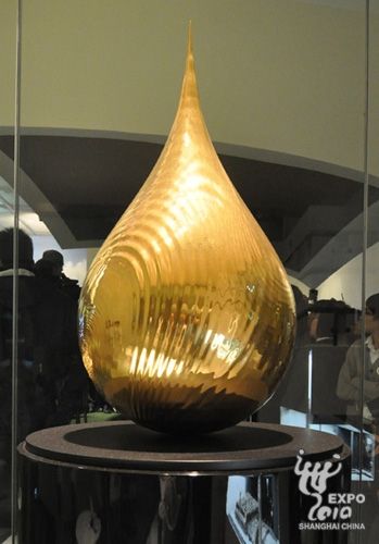 本届世博会上,捷克馆内的展品"黄金泪滴"一直备受游客关注。这件由黄金打造的展品外形犹如一颗巨型泪滴,造型优美,金光熠熠,十分夺人眼球。而且,每第500名进入捷克馆的游客才有近距离观赏这一展品的机会,并可佩戴上特制的脑电波测试仪,由馆方根据被测试者的心理活动变化制作出独一无二的香水。