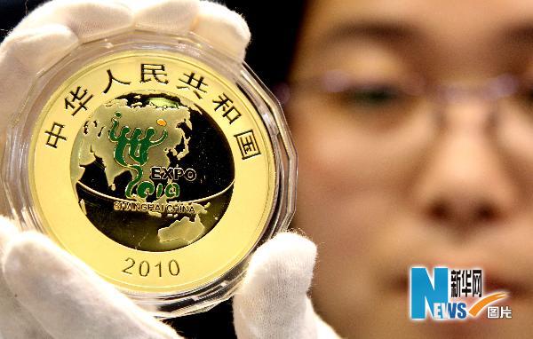4月26日,苏州巨鑫金银制品公司工作人员展示一枚金质世博纪念币(正面)。当日,由中国人民银行发行的中国2010年上海世博会第二组彩色金银纪念币亮相苏州,并将于27日上市销售。该套纪念币共4枚,其中金币2枚,银币2枚,均为中华人民共和国法定货币。新华社发(王建中 摄)