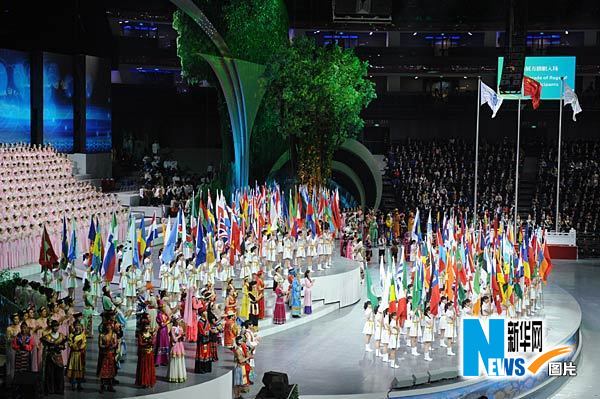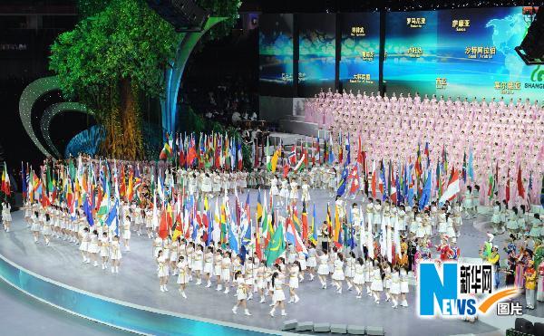 4月30日,中国2010年上海世博会开幕式在上海世博园世博文化中心举行。 这是参展方旗帜方队入场。 新华社记者陈树根摄
