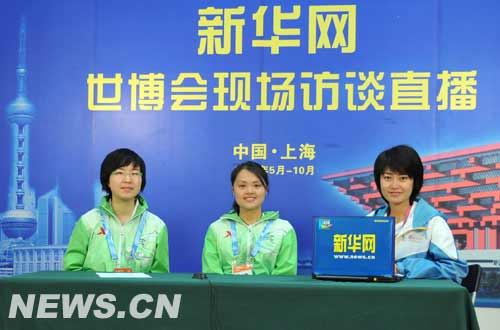 上海世博会优秀志愿者代表褚祺君、蒋若薇做客新华网上海世博会前方演播室。新华网 李非 摄