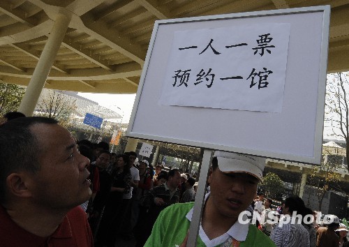 “预约”正在迅速成为上海世博会参观者的关键词。5月2日清晨,志愿者向入园民众高举预约的提示牌,不然根本进不了中国馆和热门场馆。 中新社发 贾国荣 摄