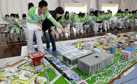 华师大世博志愿者正在“大富翁”式的沙盘前演练游世博。