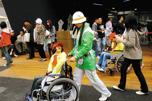 志愿者推着“5·12”大地震的残疾学生参观世博