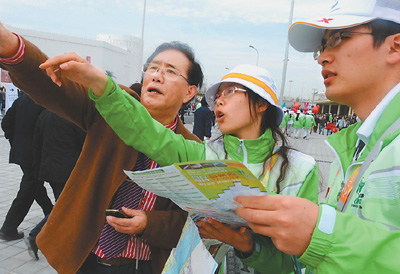 世博园区志愿者身着绿衣白裤,多是“90后”大学生,他们把自己比作生机勃勃的“小白菜”。从试运行到今天,首批“小白菜”顺利完成任务,青春活泼、任劳任怨的“小白菜”形象也逐渐获得观众认可。
