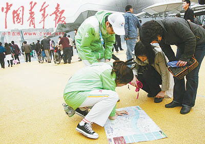 中国馆南广场上的30名首批志愿者都是来自复旦大学的学生。他们的工作在很多人看来很简单,就是疏导游客,给游客指路。他们每天要重复几万次的回答就是:“对不起,预约券已经发完了”,“您好,请往这边走”……“现在我已经不用看地图就能清楚地给游客指路了。以前还不熟悉的时候,我利用休息的时间不断地看地图,已经翻烂了两份地图,这是第三份了。”钱琲从包里翻开她的园区地图,这一份也已经快被她翻烂了,快断裂的地方她用透明胶布粘着。