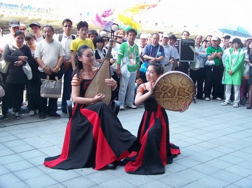 “这些学生都是来自华东师大学校内艺术团的非艺术专业学生,他们还有一个身份就是世博会的志愿者”华东师范大学学生艺术团的艺术总监崔老师介绍,“由于主题馆排队等候的时间较长,所以我们就与主题馆的领导商量,在5月15日至30日这段华师大学生志愿者在世博会服务的期间,让学生在此表演,对于这里排队等候的游客而言,这也是一种调剂。”