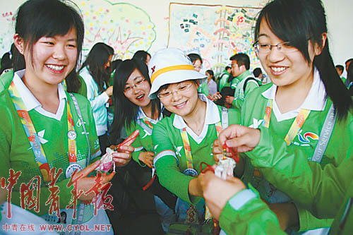 5月30日,上海世博园,即将上岗的第三批园区志愿者正在分发降暑香囊。当天,上海世博会园区志愿者第二、三批岗位交接在这里举行。随着世博会运行的深入,人们对园区志愿者的工作也加深了理解,相关各方自发给予了志愿者力所能及的支持。