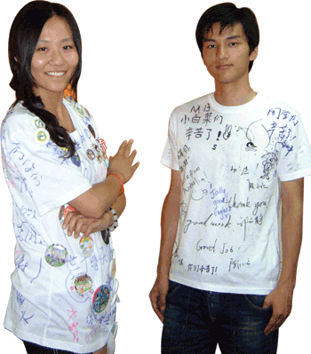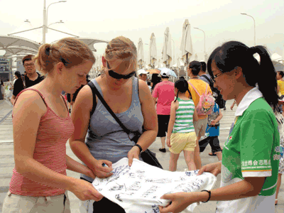世博网7月13日消息:7月10日是世博志愿者活动日,上海大学DE片区上午班的志愿者们举办了一次文化衫签名活动,让游客们把想对小白菜们说的话写在文化衫上。来自世界各地、各年龄段的百余名游客参加了这次活动。一位阿姨想来想去终于在文化衫上写道:“祝小白菜们早日找到白马王子。”旁边的男白菜可不乐意了,“我们要白雪公主!”不会写字的小朋友歪歪扭扭地画了一个她心目中的志愿者后还不忘加上一顶遮阳伞。外国友人写上“goodjob!”后竖起了大拇指……