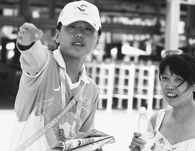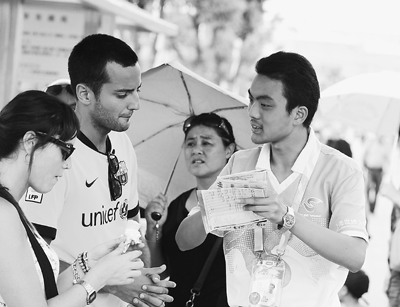 8月10日,世博园区的志愿者冒着酷暑在为游客服务……