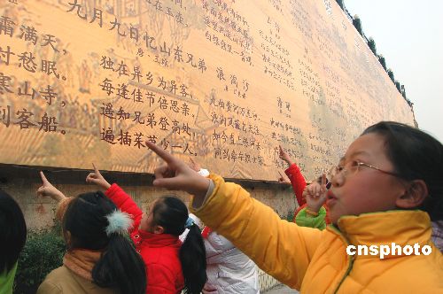 12月20日,一个450平方米的古诗文化墙在重庆云阳师范附属小学校园内落成,72首适宜小学生诵读的经典古诗以数码喷绘的形式展示在墙体上,全景体现“品经典古诗文,做中华文明人”的主旨,给学生课余学习欣赏古诗提供一本“活教材”。中新社发 周斌 摄