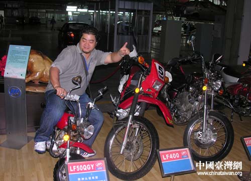 在力帆汽车公司生产车间 一台湾记者夸张的骑上了一辆儿童摩托车。(摄影:芜同)