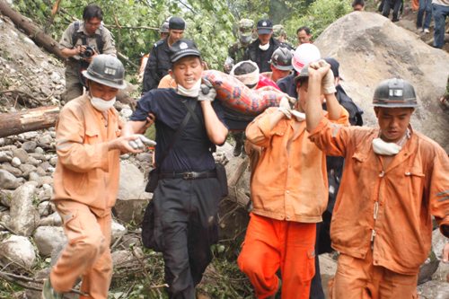 5月17日下午18时30分,深圳特警队们扛着一名重伤男子在随时可能发生滑坡的山路上步行了7个多小时后,终于将他送到了红白镇救灾医疗队。