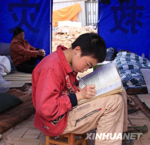 5月22日,在安县永安镇安置点的帐篷里,14岁的马启林正在看书。
