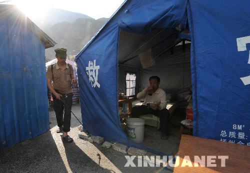 6月8日,在位于汶川县城岷江江边的救灾帐篷营地,一位受灾男子正在为帐篷营地喷洒消毒液。帐篷营地以帐篷为单位实行卫生防疫轮值。 新华社记者申宏摄