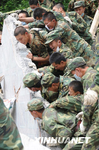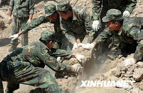 5月16日,解放军官兵在陇南地震灾区清理房屋废墟。 新华社记者 连振祥 摄