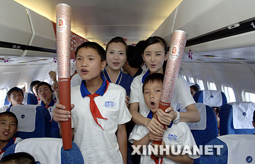 6月2日,四川地震灾区儿童和奥运火炬手曹爱(后左)、韩燕参加爱心航班上举行的奥运火炬万米高空传递体验活动。