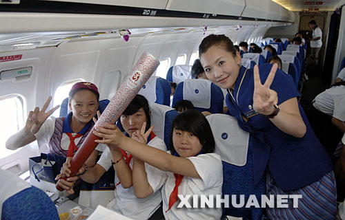 当日,89名来自四川地震灾区的儿童,乘坐南方航空公司CZ101爱心航班,飞往三亚凤凰机场,开始为期15天的“爱心呵护,阳光行动”的“心灵呵护”之旅。在爱心航班上,南方航空公司海南分公司为儿童们安排了体验奥运火炬万米高空传递、我是爱心小天使、儿童集体生日等活动。 新华社记者 赵颖全 摄