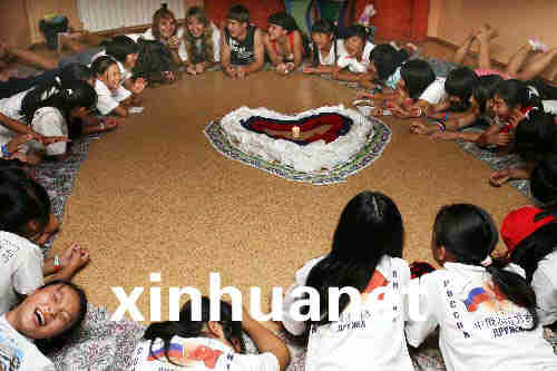 8月4日,在俄罗斯“海洋”全俄儿童中心,来自中国四川地震灾区的孩子们和俄罗斯辅导员共同参加烛光晚会。新华社记者郑悦摄