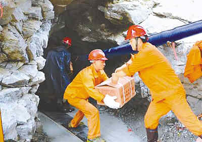 213国道线是成都至汶川县的生命线,在“5·12”大地震中因多处山体塌方而阻断至今。四川213国道抢修保通指挥部日前作出了对老虎嘴部分山体进行爆破的施工决定。从19日开始,施工人员在该山体内挖掘出一条约100米长的爆破洞,并填充了30余吨炸药(见图②)。