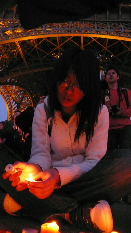 中国台湾网5月19日消息 巴黎当地时间5月18号晚,近千名在法华人、华侨、留学生和法国友人聚集在埃菲尔铁塔下,为“5·12”四川大地震遇难者举行烛光祈福会,以表达对地震灾区逝者的哀思和对生者的祝福。法国前总统希拉克的养女英瑶·特拉塞尔(Mme. Anh Dao Traxel)女士作为本次活动的主办支持人,与丈夫一起出席。法国社会党籍前部长、现任参议员让·吕克·梅朗雄也出席了本次活动。
