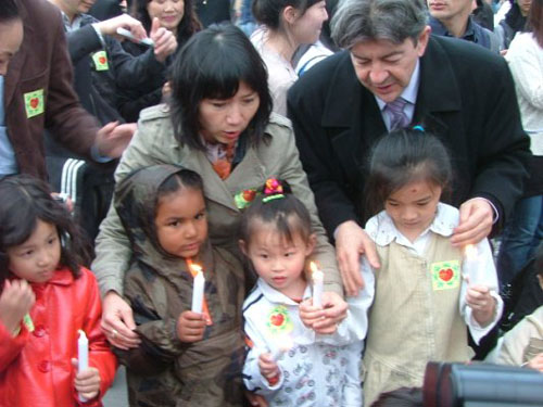 法国友人与法国华人华侨和留学生一起为四川大地震遇难者进行祈祷。图中为法国前总统希拉克的养女英瑶女士,右为法国参议员让·吕克·梅朗雄。