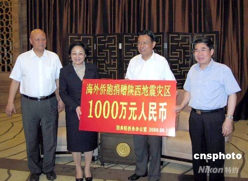 中国国务院侨办主任李海峰,六月十一日飞抵陕西西安,为汶川地震所波及的陕西地震灾区民众带来海外侨胞的深情厚意,并转交海外侨胞捐赠陕西地震灾区的一千万元人民币。中共陕西省委书记赵乐际、陕西省省长袁纯清出席了简朴的捐赠仪式。