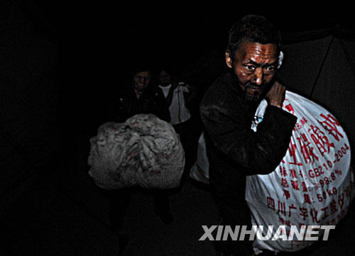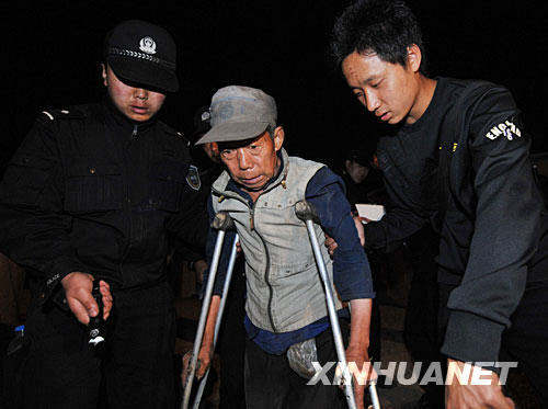 6月5日凌晨,两名特警在帮助一位老人撤离险区。从6日起,受地震破坏严重的四川省绵竹市将有持续强降雨天气,为避免滑坡、泥石流以及上游堰塞湖的威胁,当地政府部门从4日夜开始疏散处于危险区域的群众。 新华社记者 杨俊江摄
