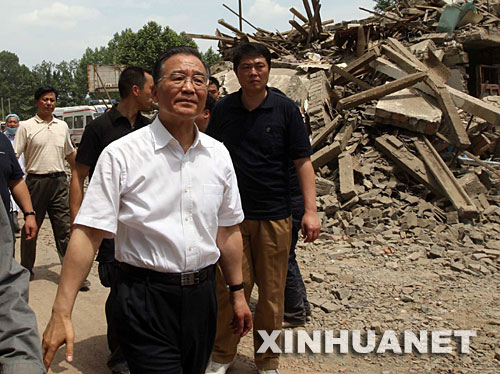 5月15日,中共中央政治局常委、国务院总理温家宝辗转赶到位于四川北部的青川县木鱼镇看望受灾群众。这是温家宝在木鱼镇文武村的临时安置点看望灾民。新华社记者 姚大伟 摄