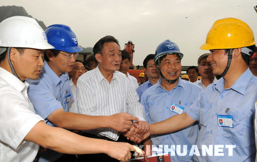 5月28日,中共中央政治局常委、全国人大常委会委员长吴邦国来到受灾严重的绵竹市汉旺镇、平武县平通镇等地察看灾情,看望企业职工和学校师生,慰问灾区干部群众和来自四面八方的救援人员。这是吴邦国在东方汽轮机厂汉旺基地与从废墟中被救出的主机一分厂厂长喻刚亲切握手。 新华社记者饶爱民摄