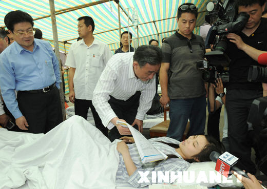 5月28日,中共中央政治局常委、全国人大常委会委员长吴邦国来到受灾严重的绵竹市汉旺镇、平武县平通镇等地察看灾情,看望企业职工和学校师生,慰问灾区干部群众和来自四面八方的救援人员。这是吴邦国在德阳市第一人民医院的帐篷病房,叮嘱汉旺镇应届高三毕业生范琴好好养伤,祝愿她在高考中取得好成绩。 新华社记者黄敬文摄