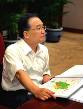 8月5日,中共中央政治局常委、国务院总理、国务院抗震救灾总指挥部总指挥温家宝在北京中南海主持召开总指挥部第24次会议,讨论汶川地震灾后恢复重建总体规划。这是温家宝在观看《国家汶川地震灾后恢复重建总体规划图集(初稿)》。(新华社记者刘建生摄)