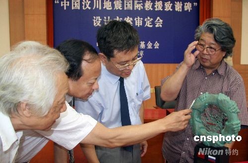 中国人权发展基金会当天在北京举行“汶川地震国际救援致谢碑”设计方案审定会,由中国雕塑学会名誉会长、中央美术学院雕塑系教授曹春生领衔设计的“汶川地震国际救援致谢碑”模型揭开面纱。曹春生介绍说,致谢碑以五双相握的手支撑起的青铜圆环为主体造型,寓意世界五大洲心手相连、共抗灾难,致谢碑基座刻有中国及受赠国国旗,并用两国语言镌刻纪念碑文以及受赠国救援或医疗队队员名字。致谢碑总高不小于三米,主体雕塑与基座比例约一比一,一般将选择放置于受赠国一处户外的公共场所。