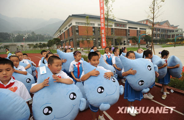 9月1日,在都江堰市北街小学新校区,小学生们手抱校方制作的代表感激的“水滴娃娃”。 新华社记者 江宏景 摄