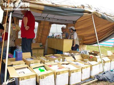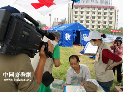 20日下午,台湾红十字组织医疗队带约3吨医疗用品等物资前往广汉市,21日在高坪镇,23日在体育场救灾点设立医疗救护站,展开救护服务。救护站设有中、西医。从21日至24日共计诊治476名。对数十名老弱灾民进行体检,做了一台气胸手术、两个骨折手术。和一个头皮缝合小手术。内、外科,儿科,针灸,急处方发药点。巴蜀音像制作中心 兰志泉 摄