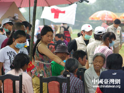 20日下午,台湾红十字组织医疗队带约3吨医疗用品等物资前往广汉市,21日在高坪镇,23日在体育场救灾点设立医疗救护站,展开救护服务。救护站设有中、西医。从21日至24日共计诊治476名。对数十名老弱灾民进行体检,做了一台气胸手术、两个骨折手术。和一个头皮缝合小手术。内、外科,儿科,针灸,急处方发药点。巴蜀音像制作中心 兰志泉 摄