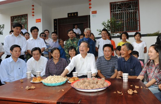 9月24日,温家宝在青川县凉水镇凉华村灾后村民新居院内向村民了解安居房建设情况。新华社记者黄敬文摄