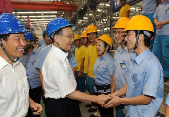 9月25日,温家宝在东方汽轮机有限公司新生产基地看望一线工人。新华社记者黄敬文摄