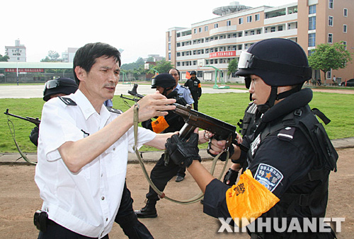 郭韶翔(左)在指导防暴队员训练(8月17日摄)。