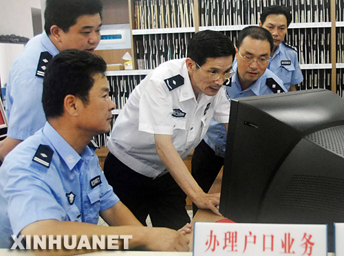 郭韶翔(左三)在龙岩曹溪派出所检查计算机人口信息管理系统。