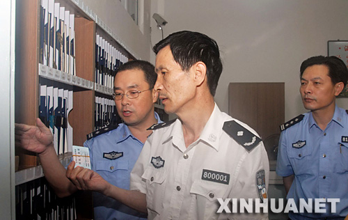 郭韶翔(中)在龙岩曹溪派出所检查第二代居民身份证制作、发放情况。