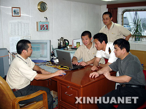 这是2005年,陆会胜船长(左二)在海上召开科考船主要领导成员会议。 新华社发