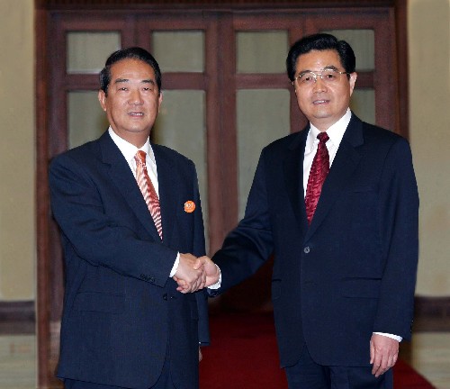 2005年5月12日,中共中央总书记胡锦涛在北京人民大会堂东大厅会见亲民党主席宋楚瑜率领的亲民党大陆访问团全体成员。 新华社记者李学仁摄