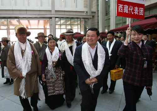 10月12日,出席中国共产党第十七次全国代表大会的西藏代表团代表抵达北京。新华社记者 黄敬文 摄