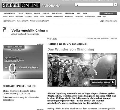 图为德国《明镜》周刊网站在显著位置刊登我矿透水事故救援奇迹的网页。(图片来源:光明日报)