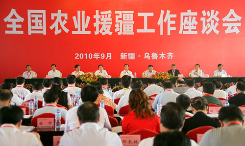 座谈会上还举行了农业援疆合作项目签约仪式,农业部18个部属事业单位与新疆方面达成相关技术、人才、项目合作意向;河北、河南等12个省市有关部门与新疆各地市农牧部门共签订50多个援助项目协议书。